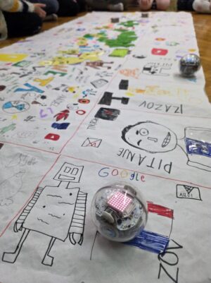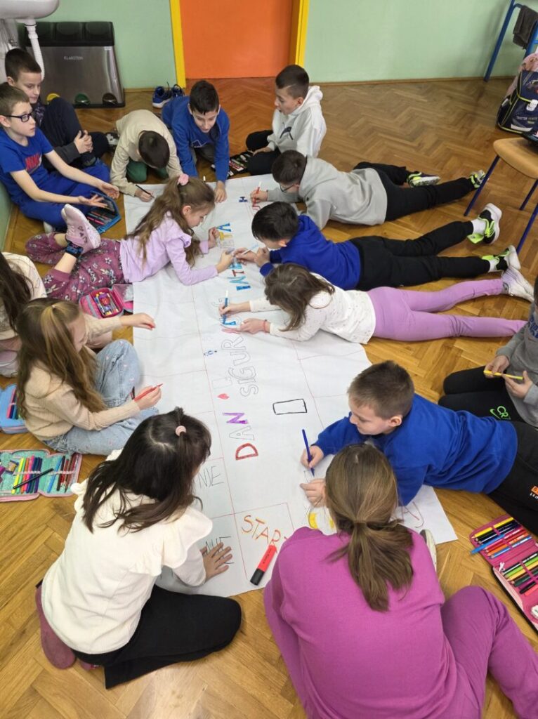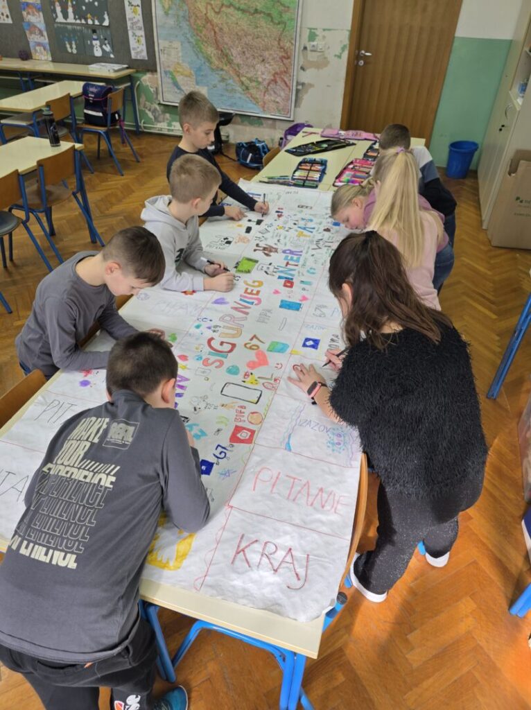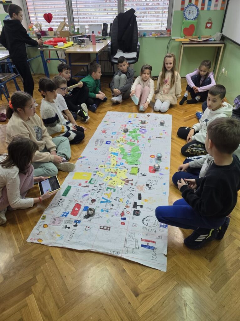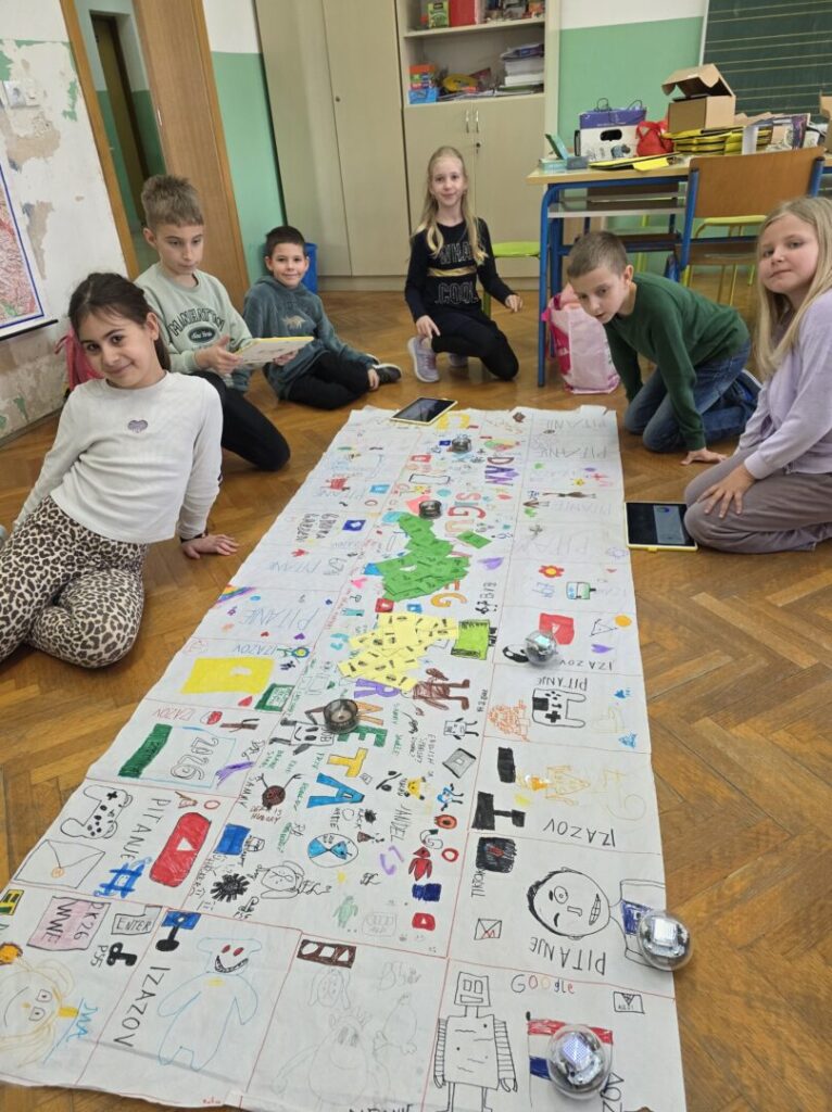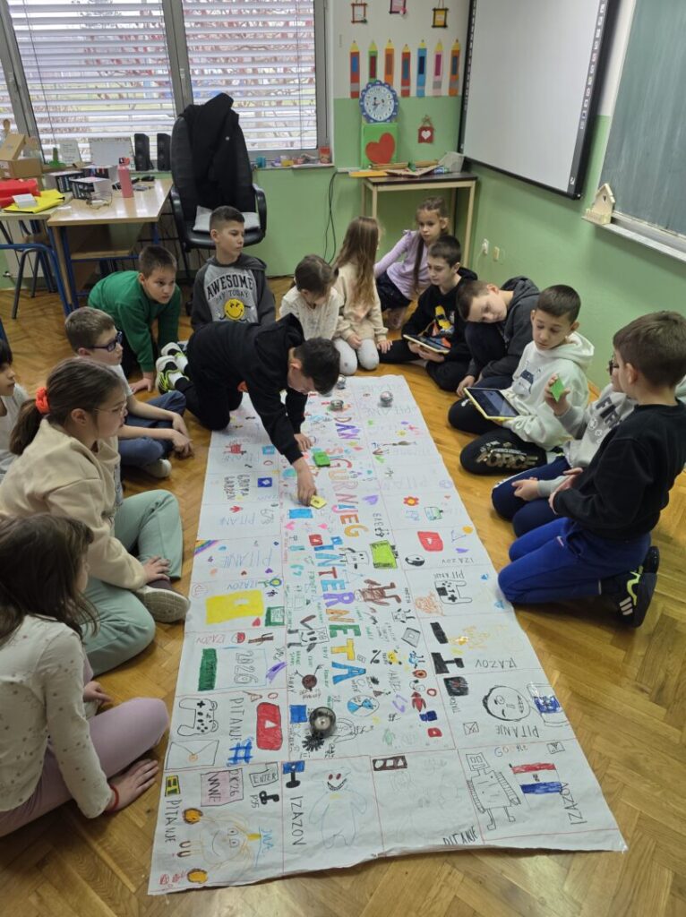 Mali robotičari, s učiteljicom Antonijom Petrinović, obilježili su Dan sigurnijeg interneta na kreativan i poučan način – izradom vlastite društvene igre. Učenici su zajedničkim radom osmislili pitanja i izazove povezane sa sigurnošću na internetu, a zatim su dizajnirali i nacrtali stazu za igru ukrašenu simbolima iz informatike. Posebnost igre bila je u tome što su učenici programirali micro:bit koji je služio kao digitalna kockica i pokazivao za koliko se polja ekipa pomiče. Kao figure koristili su robote Sphero Bolt kojima su upravljali tijekom igre. Na taj su način spojili znanje iz programiranja, robotike i digitalne sigurnosti.